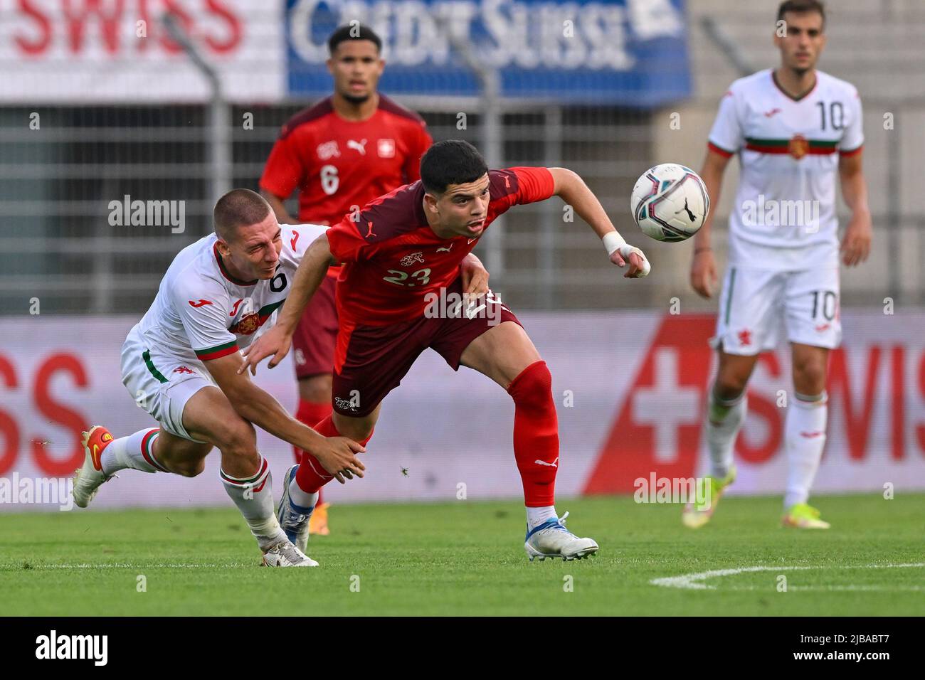 Lugano Schweiz 04 Juni 2022 Mohamed Zeki Amdouni 23 Schweiz U21 Und Valentin Antov 6 Bulgarien U21 Wahrend Der Uefa U21 Championship 2023 Qualification Group E Zwischen Der Schweiz Und Bulgarien Im